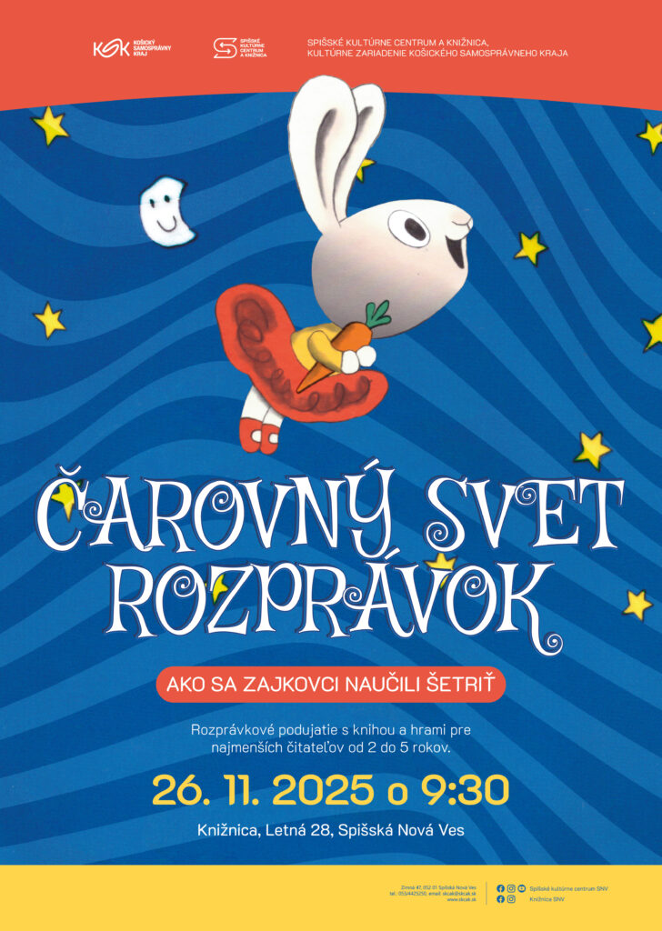 Milé deti, pripravte sa na čarovnú cestu do sveta plného rozprávok, fantázie a dobroty, v ktorom láskavosť a múdrosť kráčajú ruka v ruke s poznaním a dobrodružstvom. V rámci obľúbeného cyklu Čarovný svet rozprávok sa spolu vydáme v ústrety dobrodružstvu, ktoré sa uskutoční 26. novembra 2025 o 9.30 hod. v Spišskom kultúrnom centre a knižnici, kultúrnom zariadení Košického samosprávneho kraja. Počas tohto výnimočného podujatia sa ponoríme do tajomstiev peňazí. Spoznáme, čo sú peniaze a ako fungujú, prečo je dôležité šetriť a rozumne hospodáriť, ako sa tvorí rodinný rozpočet a akým spôsobom si možno splniť svoje sny vďaka zodpovednému sporeniu. Nezostaneme však iba pri slovách. Vďaka interaktívnym hrám a tvorivým aktivitám si prakticky ukážeme, ako múdro narábať s financiami, ako plánovať a rozhodovať sa s rozvahou, a pritom si zachovať radosť z objavovania a učenia. Čaká vás dopoludnie, ktoré spojí rozprávkovú fantáziu s múdrosťou skutočného života.