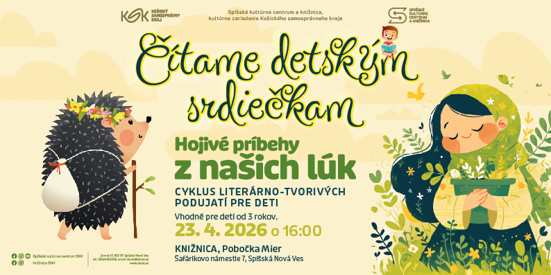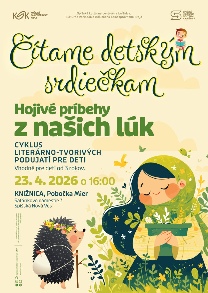 V Spišskom kultúrnom centre a knižnici, kultúrnom zariadení Košického samosprávneho kraja, v Pobočke Mier, vás 23. apríla 2026 o 16.00 hod. srdečne pozývame na výnimočné stretnutie detí a rodičov. V rámci cyklu Čítame detským srdiečkam spoločne spoznáme čarovný príbeh s názvom Hojivé príbehy z našich lúk. Vydáme sa na pomyselnú prechádzku rozkvitnutými lúkami, kde objavíme tiché poklady prírody – liečivé bylinky a voňavé kvety, ktoré dokážu liečiť telo, ale aj pohladiť dušu. Spoločne budeme odhaľovať, akú silu ukrývajú bylinky, načo sú dobré a ako ich môžeme využívať v každodennom živote. Veríme, že spolu s deťmi a rodičmi prežijeme nádherné voňavé popoludnie plné príbehov, objavov a radosti. Zo stretnutia si každý odnesie hrejivý pocit, že príroda nám ponúka vzácnu pomoc a múdrosť ukrytú v každom lístku a kvete.