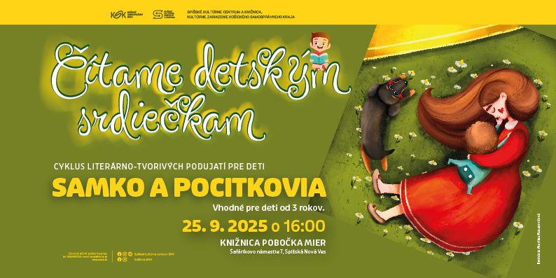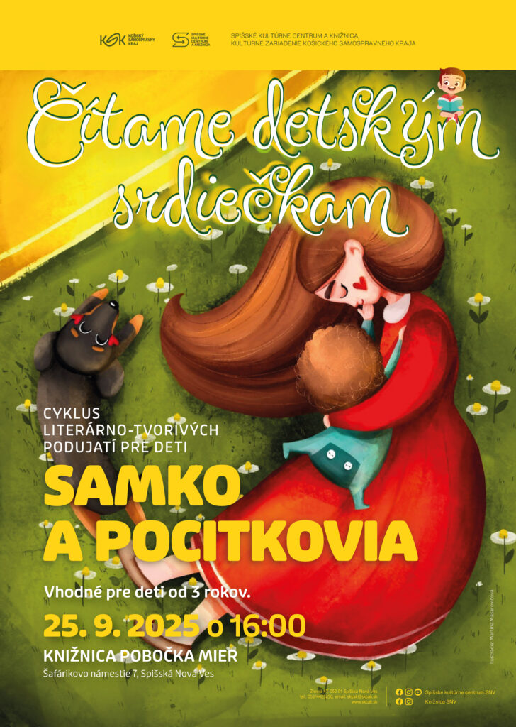 Srdečne pozývame všetky deti na ďalšie rozprávkové podujatie z obľúbeného cyklu Čítame detským srdiečkam, tentoraz s názvom Samko a pocitkovia, ktoré sa uskutoční 25. septembra 2025 o 16.00 hod. na Pobočke Mier Spišského kultúrneho centra a knižnice, kultúrneho zariadenia Košického samosprávneho kraja. Vydáme sa spolu na cestu do sveta emócií, ktorý občas dokáže byť poriadnou horskou dráhou. Spoznáme Samka a jeho kúzelných kamarátov – pocitkov. Tieto výnimočné bytosti sa objavujú vždy, keď nás zaplavia emócie – radosť, smútok, strach, hnev či láska. Spoločne odhalíme, čo nám naše pocity hovoria, ako s nimi žiť a že všetky, aj tie menej príjemné, sú prirodzené a sú súčasťou nášho života. Budeme sa rozprávať, smiať, premýšľať aj hádať. Čaká nás interaktívna hra, v ktorej sa pokúsime rozoznať a správne označiť, čo prežívajú ľudia na obrázkoch. Na záver si deti vytvoria malú výnimočnú spomienku. V tvorivej dielni spojíme fantáziu, šikovnosť a emócie do jedného krásneho diela. Príďte s nami objaviť svet pocitov! Pestrofarebný a nesmierne dôležitý.
