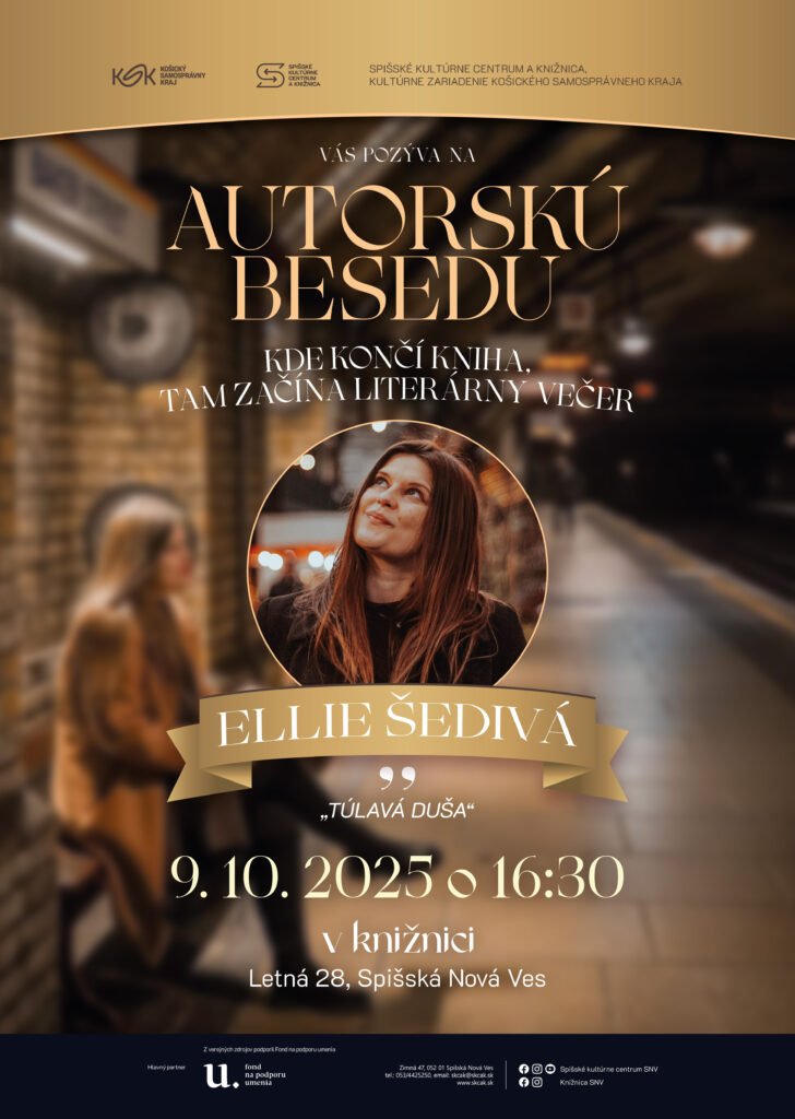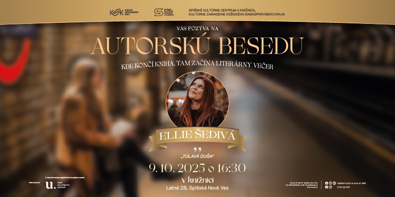 Spišské kultúrne centrum a knižnica, kultúrne zariadenie Košického samosprávneho kraja, vás srdečne pozýva na autorskú besedu so slovenskou blogerkou a spisovateľkou Ellie Šedivou.