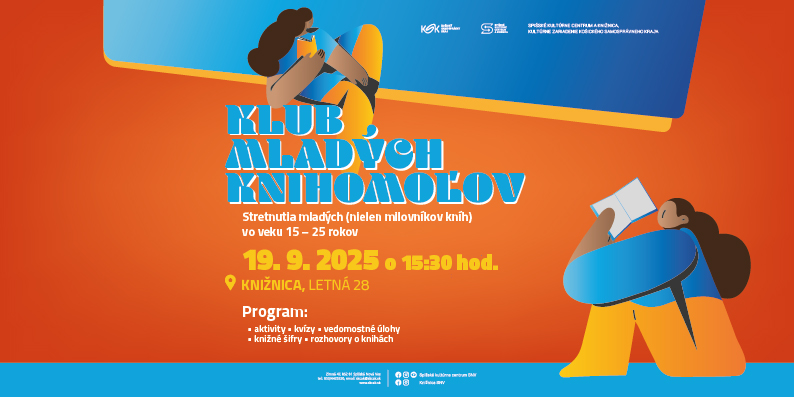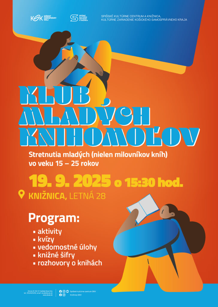 Po prázdninovej prestávke opäť pozývame mladých (nielen milovníkov kníh) vo veku 15 – 25 rokov pridať sa do nášho klubu. September je ideálny na to, aby sme sa pustili do nových výziev. Preto na našom stretnutí v Spišskom kultúrnom centre a knižnici, kultúrnom zariadení Košického samosprávneho kraja, 19. septembra 2025 o 15.30 hod. radi uvidíme nielen našich skalných knihomoľov, ale srdečne pozývame aj študentov a mladých ľudí, ktorí by sa chceli pustiť do čítania a nechať sa pritom motivovať a inšpirovať partiou ďalších knihomoľov. Témou bude rozlúčka s letom, takže sa podelíme o to, čo sme počas leta čítali a určite si tak vymeníme rôznorodé knižné tipy a čitateľské dojmy. Môžete sa tešiť aj na úlohy a aktivity pre bystré hlavičky, pri ktorých sa určite zabavíme a niečo zaujímavé sa dozvieme. Vykročme v novom školskom roku spolu do sveta kníh, ktorý rozširuje obzory. Pridajte sa do nášho klubu a poďte čítať s nami!