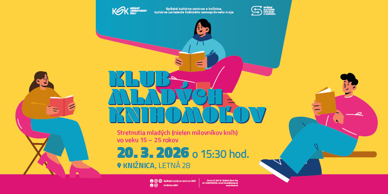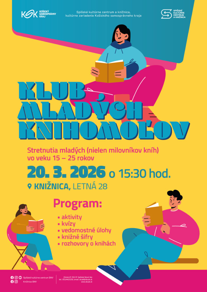Preto srdečne pozývame mladých (nielen milovníkov kníh) vo veku 15 – 25 rokov na naše stretnutie v Spišskom kultúrnom centre a knižnici, kultúrnom zariadení Košického samosprávneho kraja, na Letnej 28, ktoré sa bude konať v piatok 20. marca 2026 o 15.30 hod. Tentoraz sa zameriame na knihy a autorov, ktorým bola udelená niektorá z literárnych cien. Čaká nás prehliadka hodnotných diel, ale nebudú chýbať ani vedomostné a zábavné úlohy a aktivity. Príďte sa pri čítaní inšpirovať inými mladými ľuďmi a zoznámiť sa s knihami, ktoré naozaj stoja za prečítanie. Pritom môžete v priateľskom prostredí vyjadriť aj svoje názory a dojmy alebo si len vypočuť ostatných. Môžete sa tešiť na príjemnú spoločnosť mladých knihomoľov, horúcu čokoládu, veľa dobrých kníh a zábavy. Tešíme sa na vás.