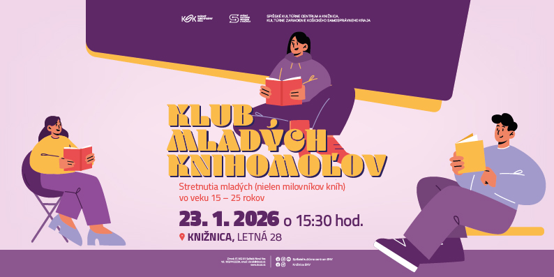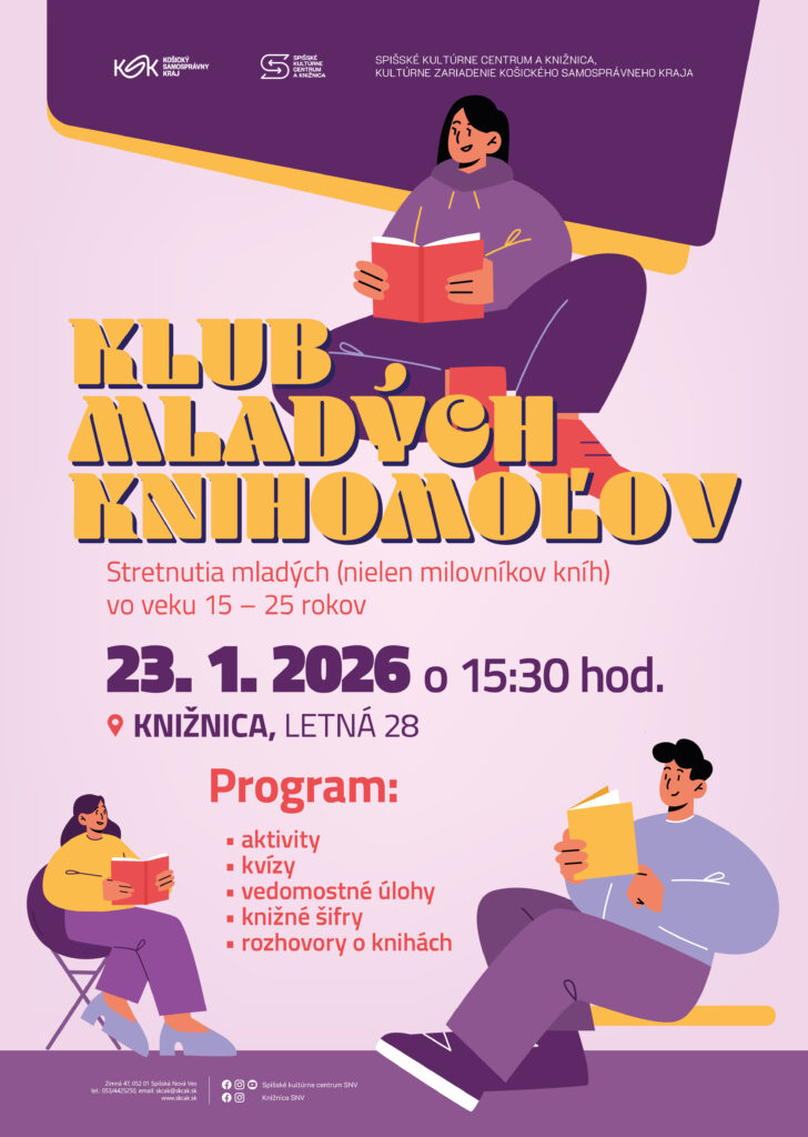Mladí ľudia majú často dostatok voľného času, no niekedy ani nevedia, ako im ubehne. Čo takto pokúsiť sa tráviť menej času na sociálnych sieťach a namiesto toho viac a pravidelne čítať? Na stretnutiach Klubu mladých knihomoľov sa môžete pri čítaní nechať inšpirovať inými mladými ľuďmi, spoznať aj knihy, s ktorými sa v škole nestretnete, dozvedieť sa všeličo zaujímavé a rôzne pikošky, či už o knihách a spisovateľoch, ale aj z mnohých iných oblastí. V priateľskom prostredí môžete vyjadriť svoje názory a dojmy alebo si len vypočuť ostatných. Všetkých mladých (nielen milovníkov kníh) vo veku 15 – 25 rokov preto pozývame na stretnutie, ktoré sa bude v Spišskom kultúrnom centre a knižnici, kultúrnom zariadení Košického samosprávneho kraja, konať v piatok 23. januára 2026 o 15.30 hod. Témou stretnutia bude William Shakespeare, výnimočný básnik a dramatik anglickej literatúry. Čakajú na vás aj vedomostné a zábavné úlohy a aktivity, horúca čokoláda, veľa dobrých kníh a zábavy.
