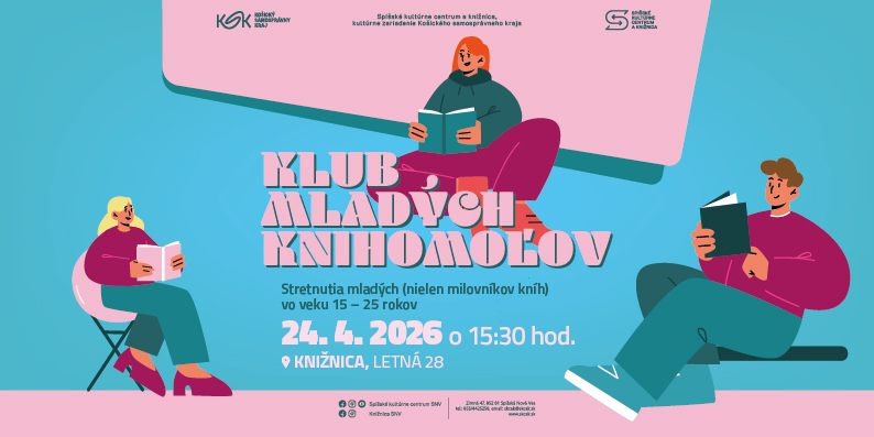 V piatok 24. apríla 2026 sa v Spišskom kultúrnom centre a knižnici, kultúrnom zariadení Košického samosprávneho kraja, na Letnej 28 bude o 15.30 hod. opäť konať stretnutie Klubu mladých knihomoľov, na ktoré pozývame našich skalných, ale aj nových, mladých knihomoľov vo veku 15 – 25 rokov.