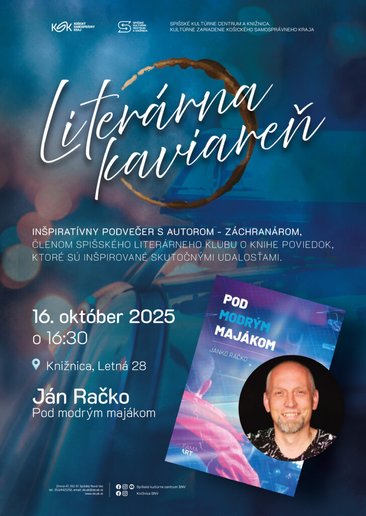 Pozývame vás na stretnutie s autorom, ktorého tvorba si zaslúži pozornosť a dokazuje, že aj na východe Slovenska sa slovenská literárna základňa rozrastá. Podujatie sa uskutoční 16. októbra 2025 o 16.30 hod. v priestoroch Spišského kultúrneho centra a knižnice, kultúrneho zariadenia Košického samosprávneho kraja, na Letnej 28.