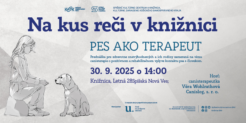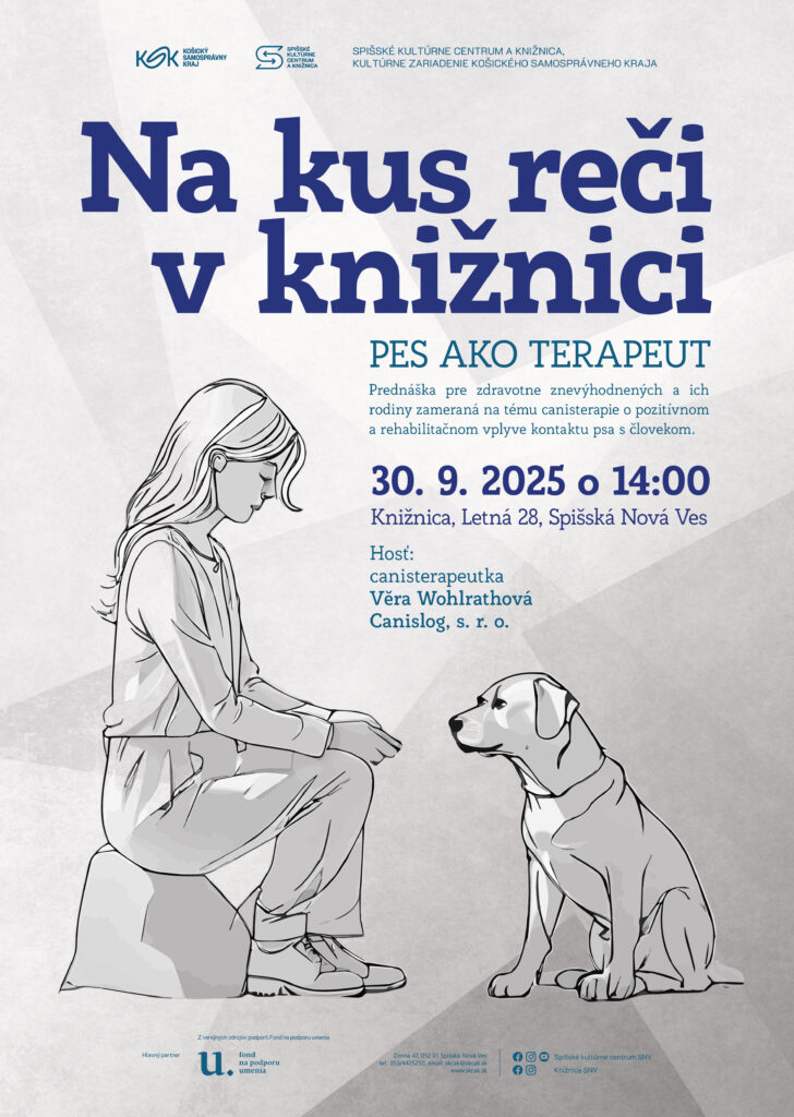 Spišské kultúrne centrum a knižnica, kultúrne zariadenie Košického samosprávneho kraja, srdečne pozýva na podujatie s názvom Na kus reči v knižnici ľudí so zdravotným znevýhodnením a ich rodiny, ale aj každého, kto sa chce dozvedieť viac o canisterapii. Na prednáške s canisterapeutkou Věrou Wohlrathovou, ktorá sa bude konať v utorok 30. septembra 2025 o 14.00 hod. v knižnici na Letnej 28, sa dozviete o pozitívnom a rehabilitačnom vplyve kontaktu psa s človekom, ktorý prispieva k zlepšeniu duševného zdravia, motoriky a prináša mnohé ďalšie benefity. Môžete sa tešiť aj na účasť psa s canisterapeutickým výcvikom. Na záver si môžete dopriať aj trochu tvorivého relaxu v našej tematickej tvorivej dielni.