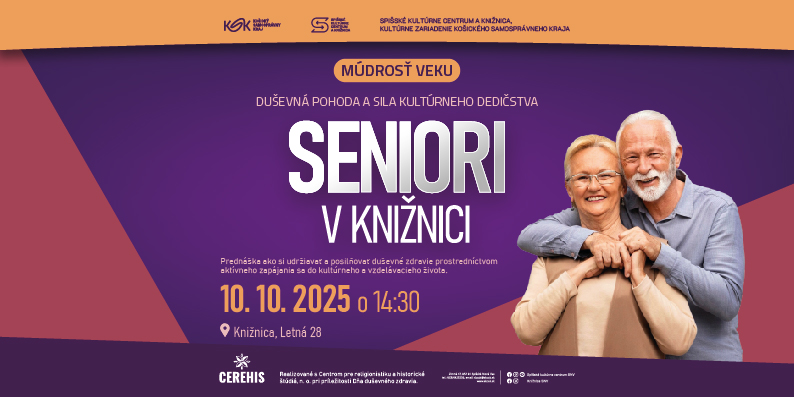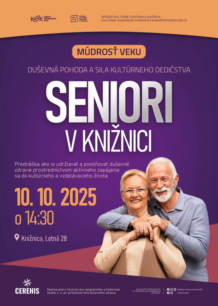 Srdečne pozývame všetkých seniorov na ďalšie tematické popoludnie z cyklu Seniori v knižnici. Spišské kultúrne centrum a knižnica, kultúrne zariadenie Košického samosprávneho kraja, v spolupráci s Centrum pre religionistiku a historické štúdiá pripravilo tentokrát prednášku na tému duševného zdravia a pohody. Seniori sa dozvedia o tom, ako si zlepšiť duševné zdravie vďaka kultúre a vzdelávaniu a ako dokáže kultúrne dedičstvo ich duševnú pohodu podporiť a udržať. Ako sa do kultúrneho života a vzdelávania zapojiť, sa môžu seniori dozvedieť v piatok 10. októbra 2025 o 14.30 hod. v priestoroch knižnice na Letnej 28.