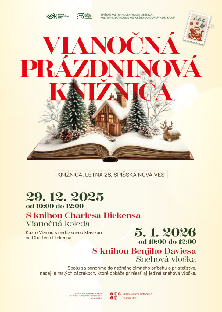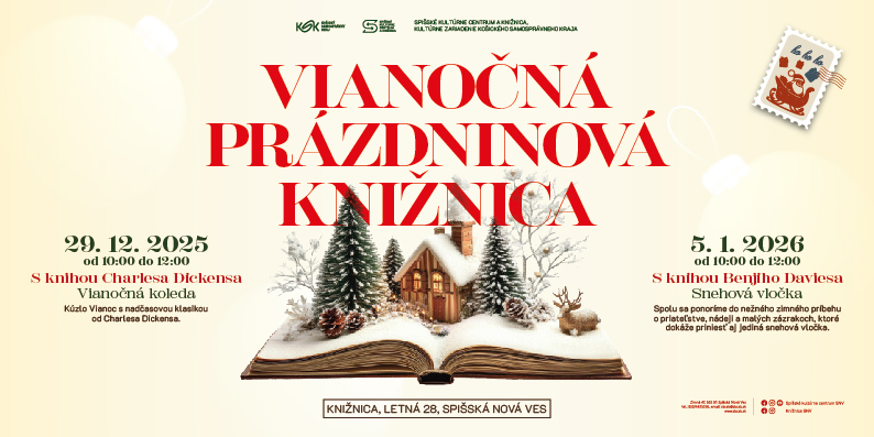 Pozývame vás do našej Vianočnej prázdninovej knižnice. V Spišskom kultúrnom centre a knižnici, kultúrnom zariadení Košického samosprávneho kraja, sa 5. januára 2026 o 10.00 hod. spolu ponoríme do tajomnej zimy, ktorá ukrýva nekonečné príbehy a zázraky. Naším sprievodcom bude Snehová vločka – drobný zázrak z neba, ktorý sa vydáva na dobrodružnú cestu, na ktorej chce nájsť svoj domov. Spolu so Snehovou vločkou objavíme, aká je zima krásna a tajomná. Porozprávame sa o tom, čo všetko môžeme v zime zažiť, od vône pečených koláčikov až po vŕzganie snehu pod nohami. Zistíme, ako sa príroda ukladá na odpočinok, ako vietor tancuje medzi stromami a ako každý zimný deň môže byť malým dobrodružstvom. Čakajú vás rozprávkové chvíle pri čítaní, tvorivé dielne, zimné hry a fantazijné rozprávanie, ktoré zahreje aj v najchladnejší deň. Príďte sa zahriať čarom príbehov, smiechom a priateľstvom. Veď aj najmenšia snehová vločka dokáže rozžiariť svet, rovnako ako dobré srdce.